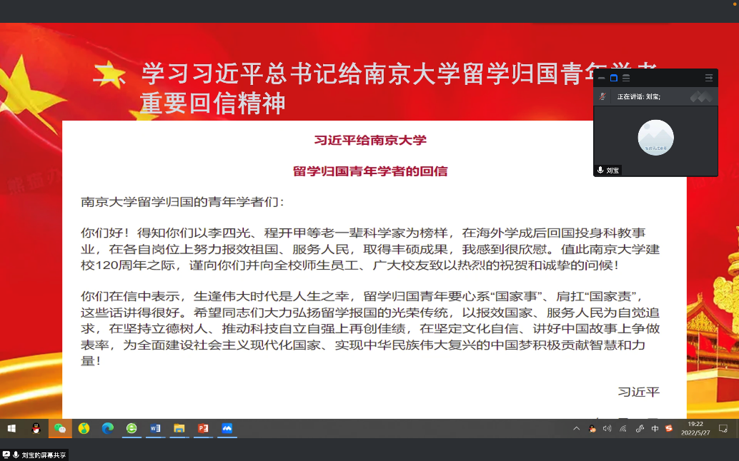 2022年5月25日,999策略白菜手机论坛教工第三党支部的党员在刘宝副教授的带领下学习了习近平总书记给南京大学留学归国青年学者的重要回信精神。